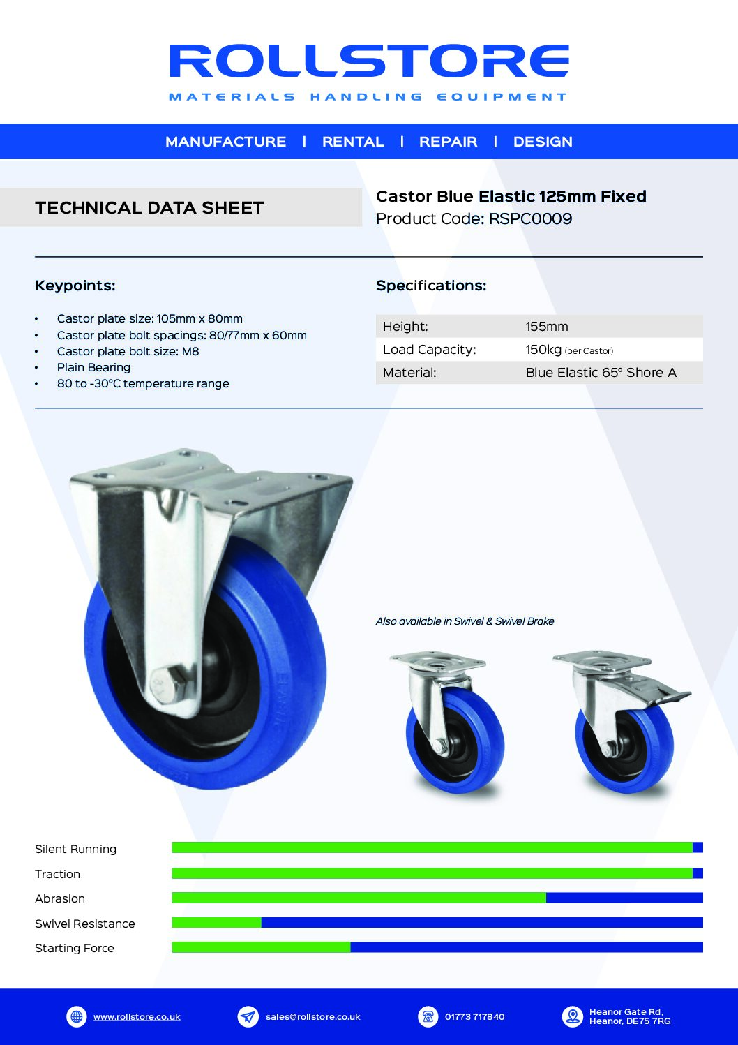 - The Fixed 125mm Blue Elastic Castor features a non-marking elastic tyre, ensuring that your floors remain scuff-free. This durability makes it an excellent choice for operations requiring frequent movement, both indoors and outdoors.