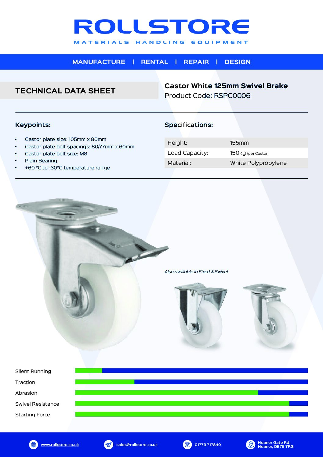 - The Swivel Brake 125mm White Elastic Castor features a non-marking elastic tyre, ensuring that your floors remain scuff-free. This durability makes it an excellent choice for operations requiring frequent movement, both indoors and outdoors.